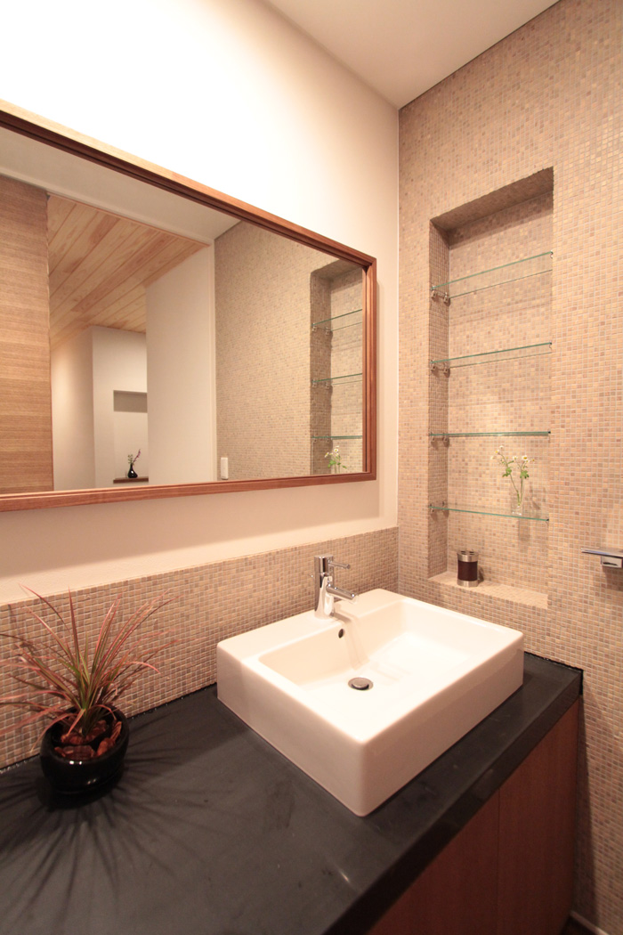 水廻りの中でも洗面室は鏡や収納棚など壁面に窓がとりにくい事が多いもの。そういう場合は鏡の上に窓を設置するのもひとつの方法です。換気のために開け閉めしにくいのでは?と思われがちですが、案外と洗面室の窓って開け閉めしないものです。隣接した浴室の窓を開けたり浴室の換気扇を回したりした方が、湿気を含んだ空気を浴室から呼び込まないのでお薦めです。